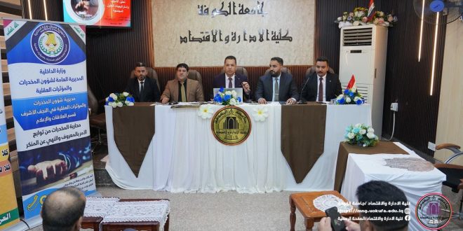عقد قسم المحاسبة في كلية الإدارة والاقتصاد بجامعة الكوفة ندوة تثقيفية موسّعة بعنوان “الشباب والمخدرات: تحليل الأسباب واستراتيجيات الحلول المجتمعية”، وذلك بالتعاون مع مديرية شؤون المخدرات والمؤثرات العقلية في النجف الأشرف، وبالتزامن مع فعاليات الأسبوع العراقي لمكافحة المخدرات، و انسجامًا مع توجيهات الجامعة في تعزيز دورها المجتمعي ونشر الوعي بين فئات المجتمع، ولا سيما شريحة الشباب.وتضمنت الندوة تسليط الضوء على التحديات المتزايدة التي تدفع بعض الشباب نحو تعاطي المخدرات، ومنها الضغوط النفسية والاقتصادية، وضعف الوعي الصحي، وغياب الرقابة الأسرية، إضافة إلى تأثير رفاق السوء وسهولة الوصول إلى المواد المخدرة في بعض البيئات. كما تناولت الندوة خطورة تفاقم هذه الظاهرة على المجتمع وضرورة تكاتف الجهود للحد منها.