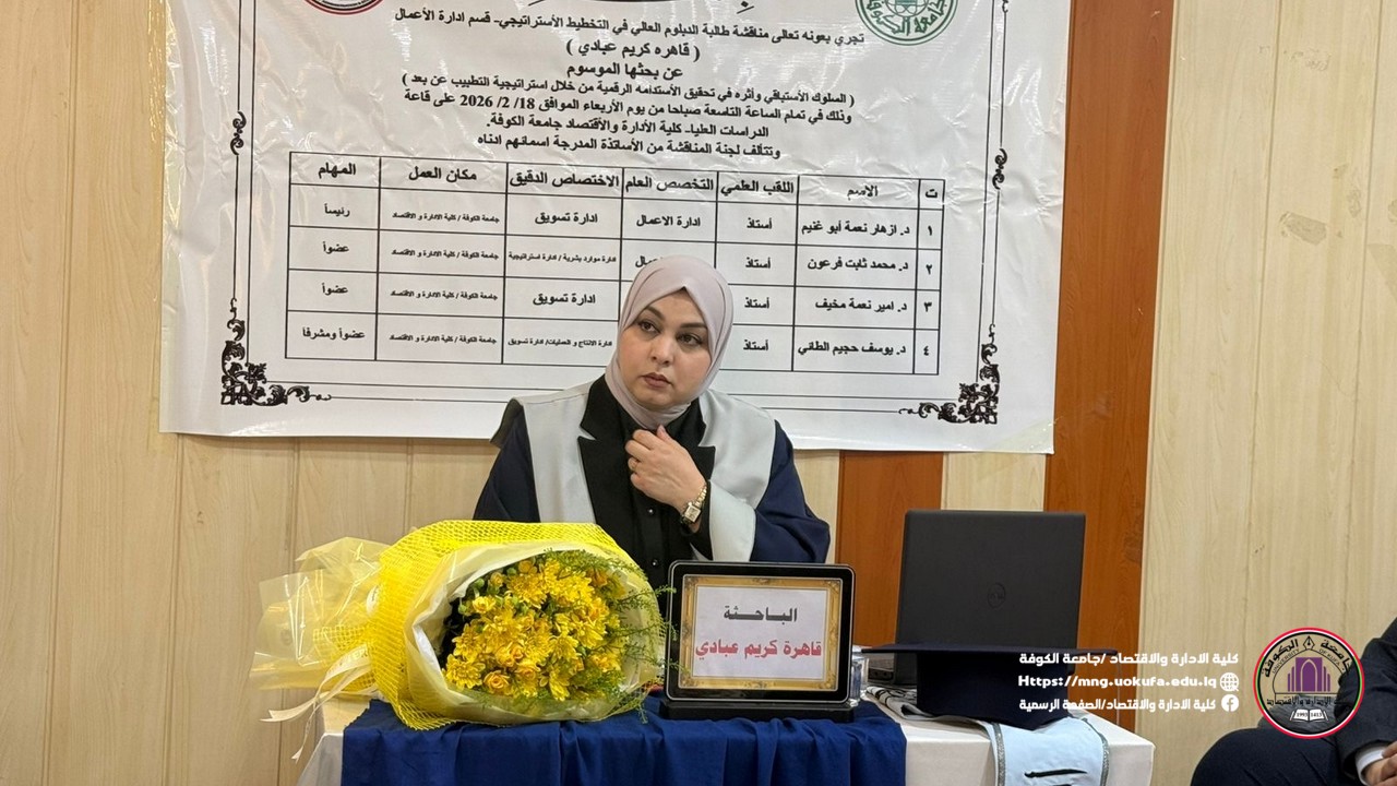 نوقش في كلية الإدارة والاقتصاد بجامعة الكوفة بحث دبلوم عالي حول (السلوك الاستباقي وأثره في تحقيق الاستدامة الرقمية الصحية من خلال استراتيجية التطبيب عن بعد دراسة تحليلية لآراء عينة من الاطباء العاملين في مستشفى النجف الأشرف التعليمي) يهدف البحث الذي تقدمت به الطالبة قاهرة كريم عبادي الى تحليل تأثير السلوك الاستباقي في تحقيق الاستدامة الرقمية في المؤسسات الصحية، من خلال الدور الوسيط لاستراتيجية التطبيب عن بعد، وذلك في إطار دراسة تطبيقية على عينة من الأطباء العاملين في مستشفى النجف الأشرف التعليمي.