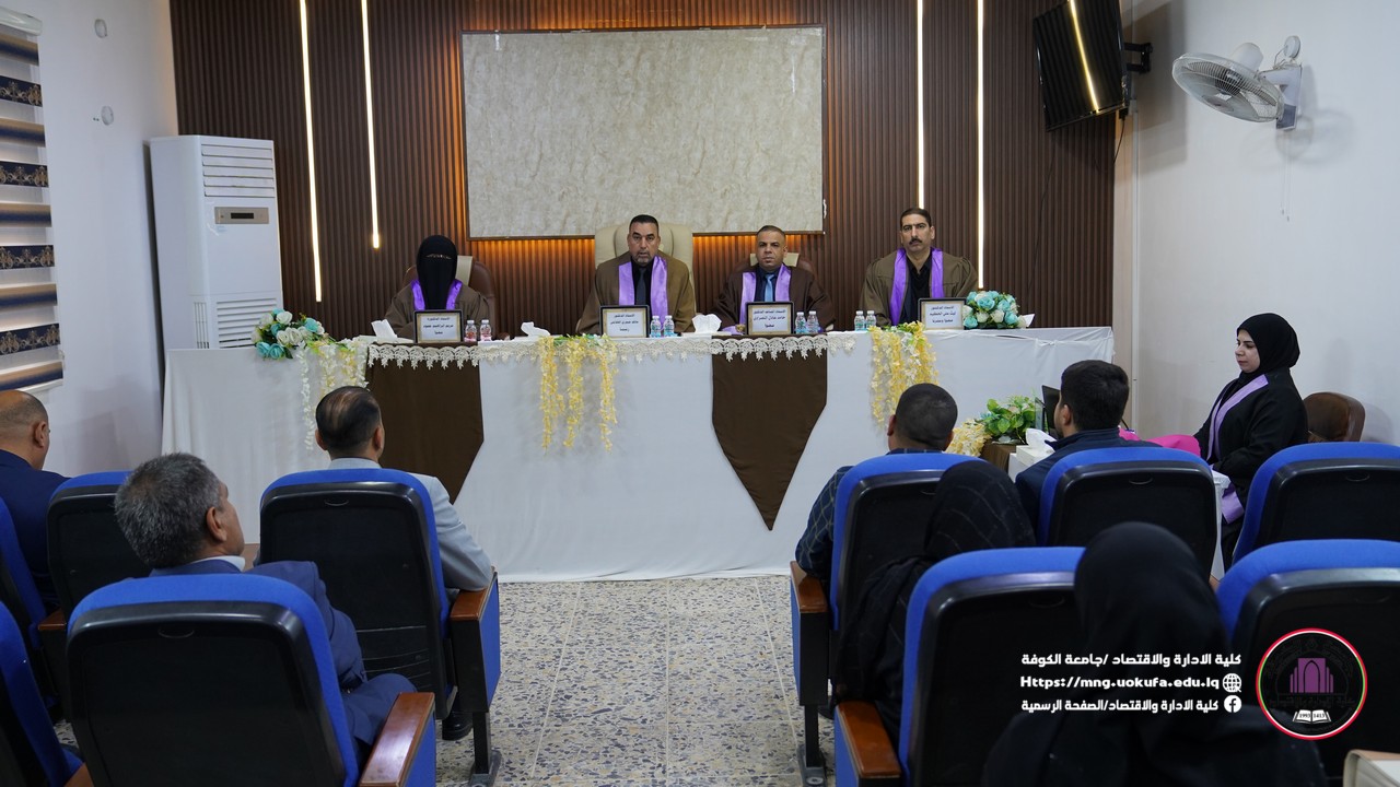 فيما نوقش ايضا البحث الموسوم (سلوك القيادة النزيهة ودورها في تعزيز التفكير الابداعي) للطالب صالح مهدي صالح تحت اشراف الاستاذ الدكتور حاكم احسوني الميالي.